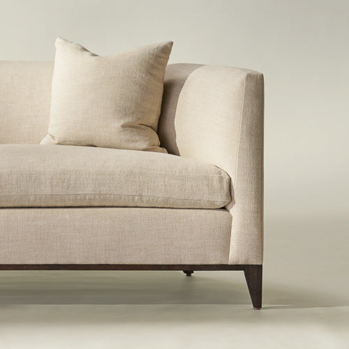 The Conversation Sofa frame is made of kiln-dried certified sustainably sourced European wood with an eight-way hand-tied spring construction. The seat and back cushions are made of a pocket-coil construction featuring feather, down and environmentally sound latex foam. The legs are made of solid American White Oak in a Brushed Dark Mocha finish.